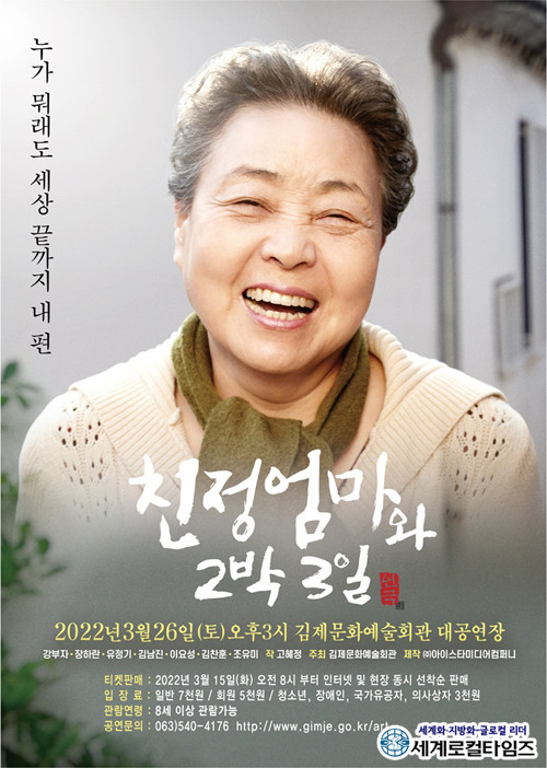 [세계로컬타임즈 조주연 기자] 스테디셀러 연극 ‘친정엄마와 2박3일’이 전북 김제 무대에 오른다.
