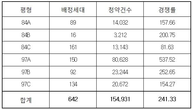 최고경쟁률은 97㎡ A타입이 차지했다. 150가구 모집에 8만628명이 청약해 경쟁률이 537 대 1에 달했다. 타입별로는 97㎡ A타입이 537 대 1로 최고경쟁률을 보인 반면 84㎡ C형은 81 대 1로 경쟁률이 가장 낮았다.