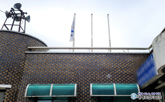 [세계로컬타임즈 조주연 기자] 전북 김제시의 한 건물 옥상에 설치된 국기 게양대에 태극기가 왼쪽에 게양돼 있다. 국기의 게양·관리 및 선양에 관한 규정에 따르면 게양대 높이가 동일한 3개의 게양대가 있는 경우 국기는 중앙에 달아야 한다.