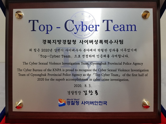 | ▲ 2020년 상반기 ‘탑 사이버팀(Top Cyber Team)’에 선정된 경북지방경찰청 사이버성폭력수사팀.(사진=경북경찰청 제공) |