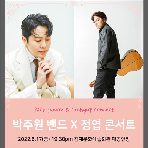 [세계로컬타임즈 조주연 기자] 전북 김제시가 “‘박주원 밴드X정엽 콘서트’를 오는 17일 오후 7시 30분 문화예술회관이 대공연장에서 개최한다”고 2일 밝혔다.