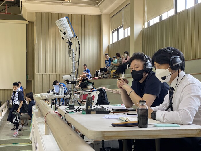 | ▲ 농구경기장에 설치된 AI 스포츠 중계 카메라와 캐스터 중계 장면 (사진=용인시) |