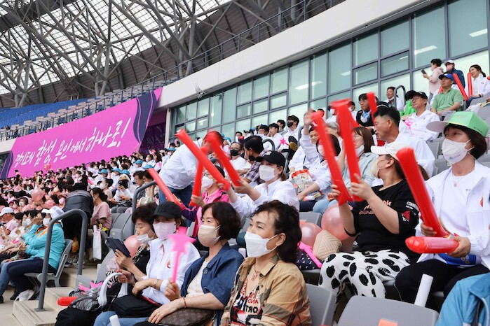 성화 점화부터 다채로운 공연까지 볼거리가 가득했던 이날 행사에서 눈길을 끈 건 바로 무대와 관중석을 가득 메운 시민들이었다. 문화와 체육이 어우러진 대회를 만들기 위해 시는 도내 10개 시군에서 자발적으로 참여한 300여명의 합창단을 비롯해 용인시민 합창 자원봉사자 200명을 추가로 모집해 연합 합창단을 꾸렸다.