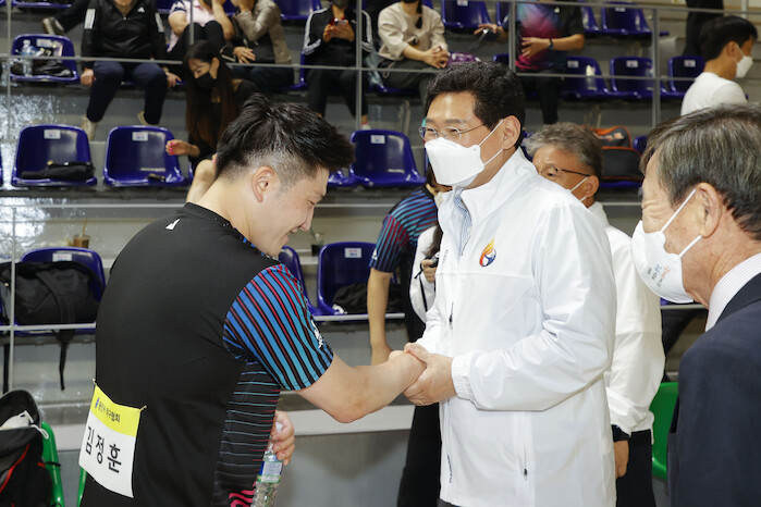| ▲ 이상일 용인시장이 탁구 김정훈 선수와 인사를 나누고 있다. (사진=용인시) |