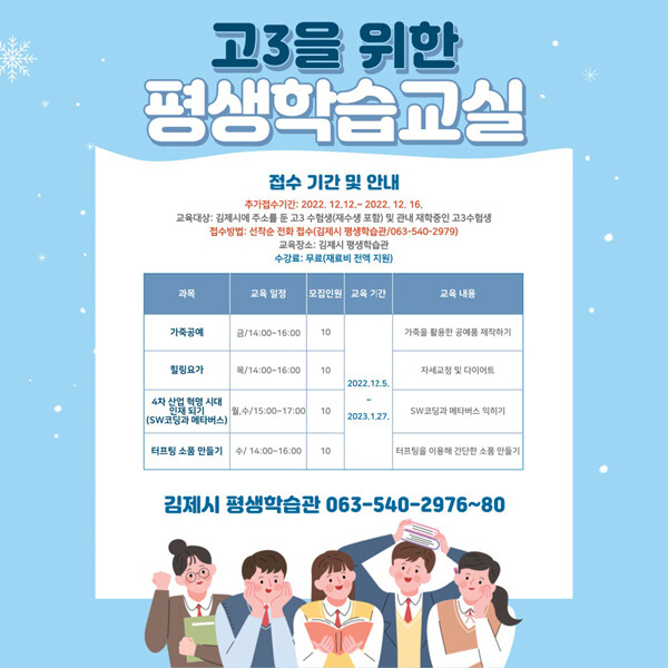 [세계로컬타임즈 조주연 기자] 전북 김제시가 고3 수험생을 위한 편성한 평생학습교실 일부 프로그램에 대해 수강생을 추가 모집한다.