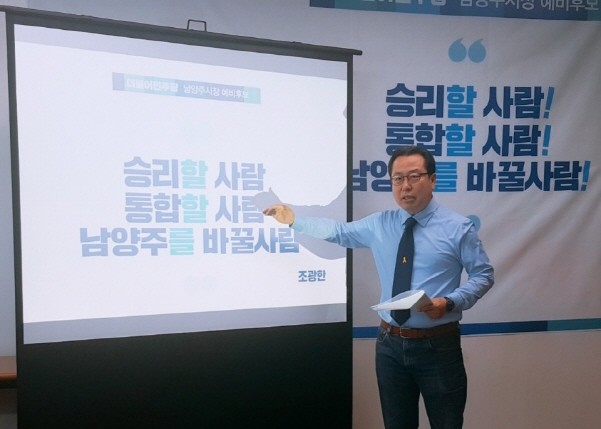 | ▲ 조광한 남양주시장 더불어민주당 예비후보가 16일 시청 브리핑 룸에서 기자회견을 열고 "남양주시의 미래를 담은 정책"을 발표하고 있다. <사진제공=조광한 선거사무실> |