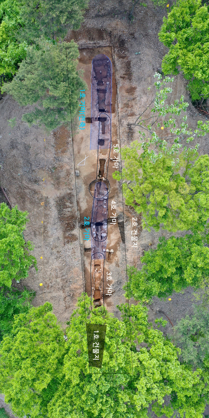 또 벽돌가마(1호) 위로 중형의 진흙가마(2호)가 축조됐고, 그 위쪽으로 소형의 진흙가마(3~5호)가 순차적으로 축조되는 아파트형 구조를 보였다. 가마는 길이(10~12m)와 너비(1.5~1.9m), 석재 화구(火口) 등 규모와 구조에서 모두 유사한 형태를 가지고 있다.