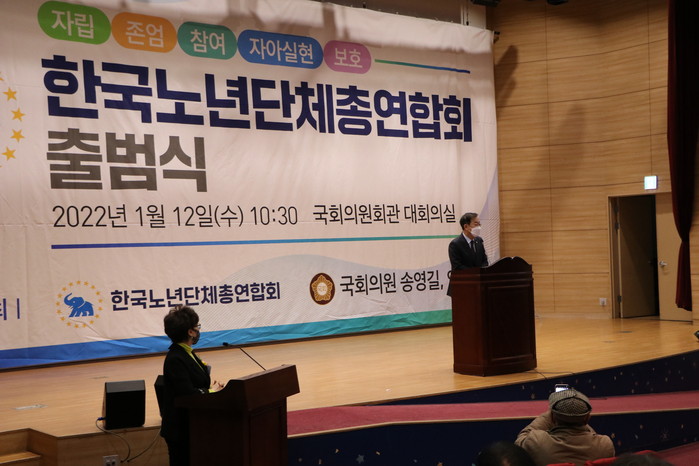 | ▲ 2021년 11월 결성해 올해 12일 전국 78개 단체 중 30여 단체가 결성해 1천만 거대 노인단체로 탄생한 ‘한국노년단체총연합회’가 국회의원회관 대회의실에서 출범식을 가졌다. 김준기 초대회장은 대회사에서 "‘청년의 꿈이 이루어지는 나라, 노년이 행복한 대동세상’을 모토로 1천만 노인들의 목소리를 대변할 것"을 천명했다. (사진=한국노년단체총연합회) |