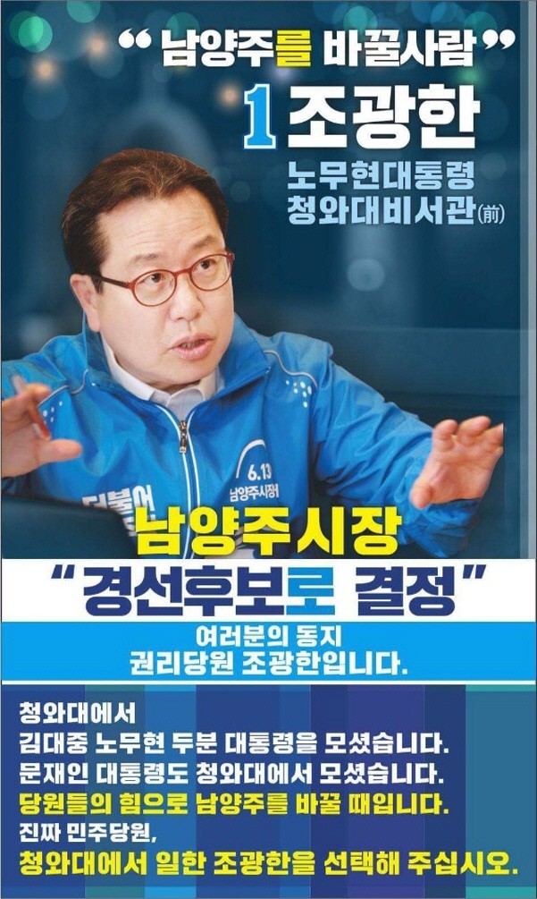 자문을 맡은 모 법무법인 관계자 역시 "조광한 경선후보자가 '문재인 대통령도 청와대에서 모셨습니다'라는 문구를 공표한 것은 공직선거법 제250조 3항을 위반해 당선할 목적으로 허위사실을 공표한 것으로 사료된다'는 의견을 낸 것으로 알려졌다.