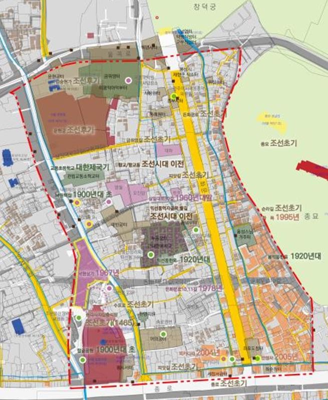 조선시대 258년 간 정궁이었던 창덕궁 앞 왕의 거둥길로 왕과 백성이 만나는 소통의 장소였던 돈화문로, 1980년대 탑골공원 경계 파고다 아케이드 철거와 함께 악기상점 이전으로 음악의 메카로 부상한 낙원악기상가, 1920년대 도시형 한옥 단지로 조성돼 도심 한복판 쉼과 여유의 공간으로 자리 잡은 익선동 한옥마을 등이 있어 더욱 매력적인 지역이다.