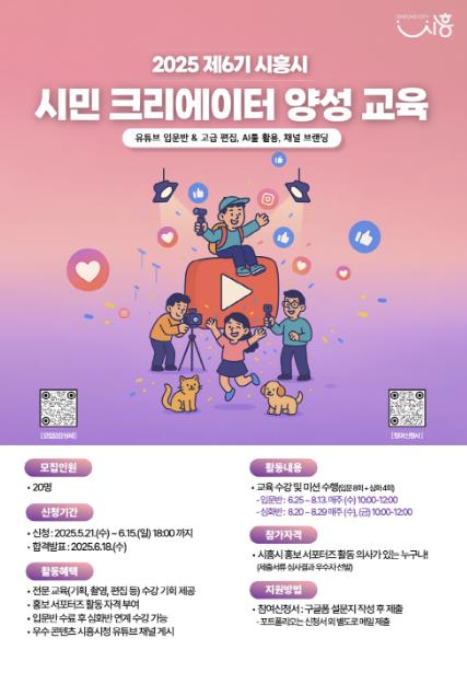 교육 참가자에게는 ▲크리에이터 심화 교육 수강 기회 제공 ▲시흥 홍보 서포터즈 활동 기회 제공 ▲우수작품 선정 시 ‘시흥시청’ 유튜브 채널 게시 등 크리에이터로 한층 더 성장할 수 있는 풍성한 혜택이 주어진다.