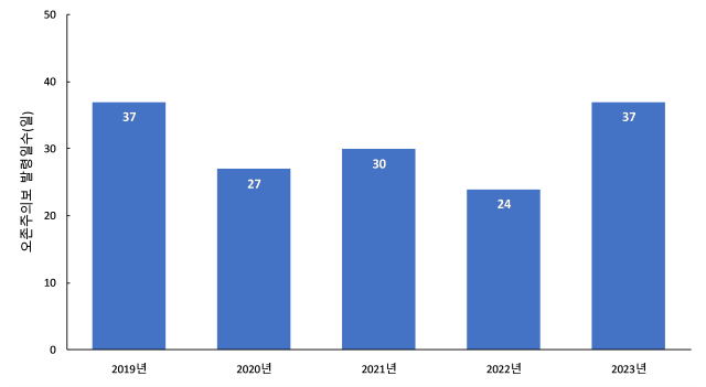 올해 발령일 수는 최근 5년간 발령일 수가 가장 많았던 2019년과 동일했으며, 2019~2023년 5년 동안 평균 31일 발령했다.
