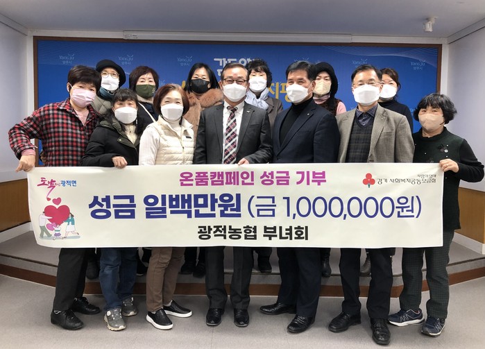 [세계로컬타임즈 한기선 기자] 광적농협 부녀회(회장 박보윤)는 지난 13일 양주시 광적면(면장 권순용)을 찾아 관내 취약계층의 따뜻한 겨울나기를 위한 온품캠페인 성금 100만 원을 기탁했다.