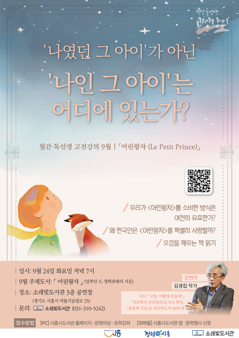 이번 강연에서는 강연자인 인문학자 김경집 작가는 고전의 내, 외부적 요소를 모두 맛볼 수 있는 신선한 강연으로 참여자를 안내한다. 김경집 작가는 ‘어린왕자’를 ‘나’와 연결해 내적 성찰을 할 수 있도록 안내하며, 책을 읽는 과정에서 오감을 깨우는 경험을 제공할 예정이다.
