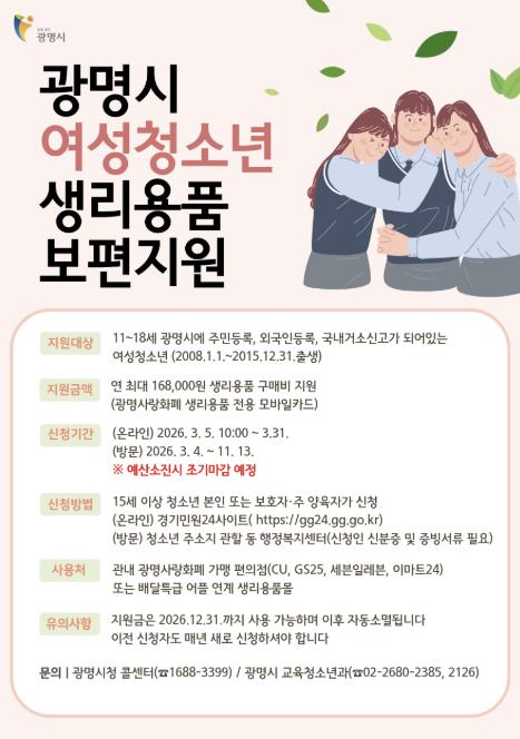지원 대상은 광명시에 주민등록을 둔 11세부터 18세까지(2008. 1. 1.~2015. 12. 31. 출생) 여성청소년이며, 등록외국인과 국내거소신고자도 포함한다.