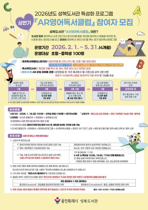시 관계자는 “AR영어독서클럽 참여자는 도서관에 방문해 영어독서 수준 진단 등을 거친 후 수준에 맞는 영어 원서를 읽고, 온라인으로 영어 독서 퀴즈를 풀며 영어 실력을 향상시킬 수 있다”며 “상반기 과정 후엔 AR ‘리딩 히어로’ 5명을 뽑아 하반기 AR영어독서클럽 참여자격을 자동으로 부여하는 혜택도 새로 신설했으니 많은 관심과 참여를 부탁드린다”고 말했다.