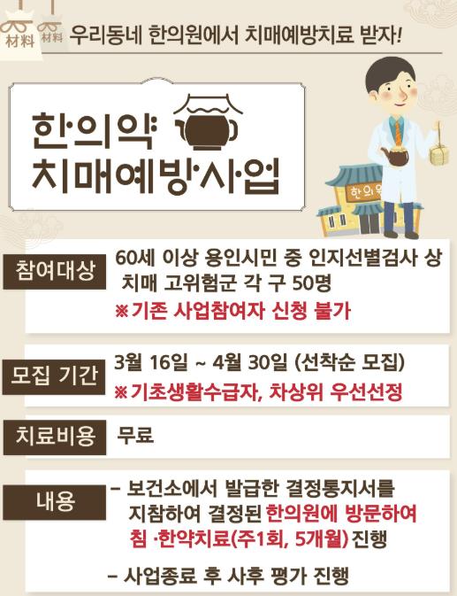 모집 대상은 용인시에 거주하는 60세 이상 시민 가운데 경도인지장애 진단을 받은 치매 고위험군으로, 오는 4월 30일까지 처인·기흥·수지 3개 구별로 각각 50명까지 지원할 계획이다.