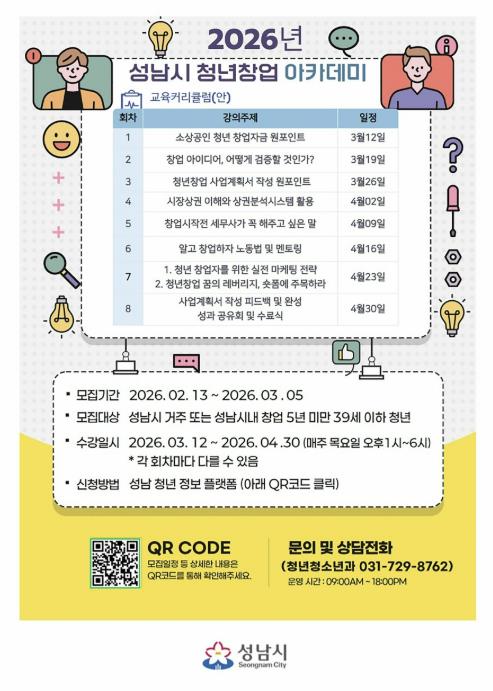 [세계로컬타임즈] 성남시는 오는 3월 5일까지 ‘청년창업 아카데미’ 무료 교육생 30명을 모집한다.