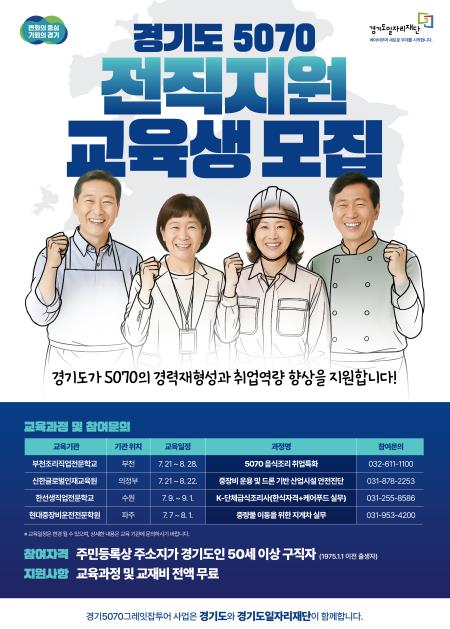 이번 사업은 ‘경기도 5070 일자리박람회’의 참여자와 재취업을 희망하는 중장년층을 지원하기 위해 ▲5070 음식조리 취업특화 과정 ▲중장비 운용 및 드론기반 산업시설 안전진단 과정 ▲K-단체급식 조리사 과정 ▲중량물 이동을 위한 지게차 실무과정의 4개 과정, 총 155명을 모집한다.