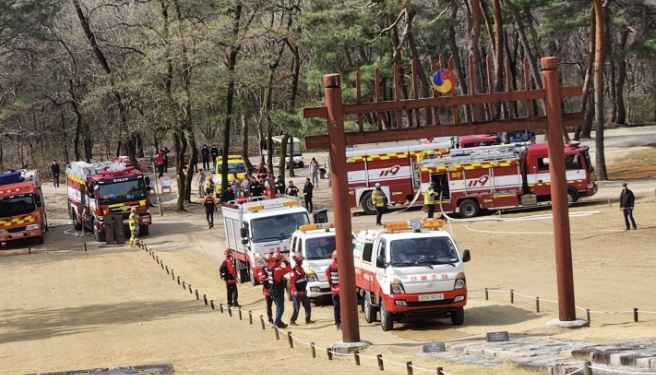 훈련은 서오릉 인근 앵봉산에서 발생한 산불이 강풍을 타고 서오릉 내 익릉(翼陵) 방향으로 급격히 확산되는 긴박한 상황을 가정해 진행됐다.