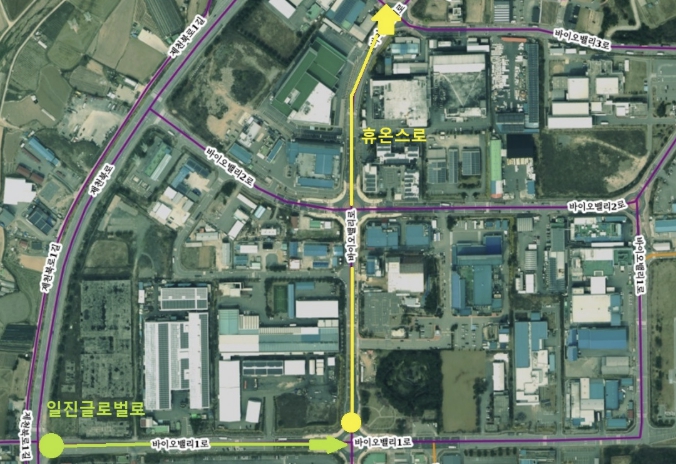 시는 지난 1월 기업 유치와 국제 교류 확대를 위해 지역 경제 활성화와 사회 발전에 기여한 휴온스와 일진글로벌의 기업 명칭을 활용해 ‘휴온스로’와 ‘일진글로벌로’를 부여했다. 명예도로명의 사용 기간은 5년 이내이며, 우편물 수령 등 실제 주소로는 사용할 수 없다.