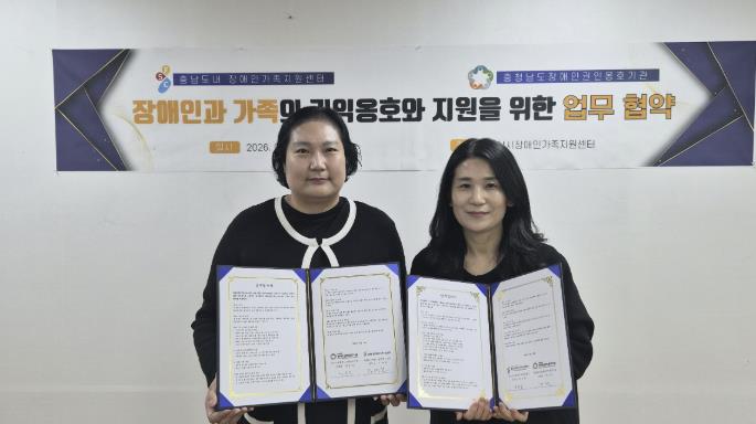 한편 충청남도장애인권익옹호기관은 장애인 학대 대응 전문기관으로서 역할을 수행하고 있으며, 이번 협약을 계기로 장애인 가족을 위한 통합적 복지 지원체계 구축에 기여할 것으로 기대를 모은다.