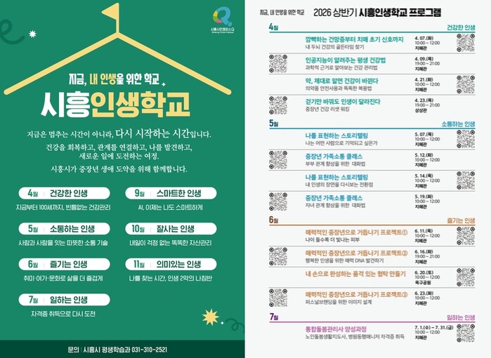 김상동 평생교육원장은 “시흥인생학교는 중장년의 삶 전반을 체계적으로 지원하는 통합형 인생 설계 플랫폼”이라며 “건강 회복에서 시작해 관계 확장, 새로운 도전과 성찰로 이어지는 여정을 통해 중장년 시민들이 스스로 삶의 방향을 설계할 수 있도록 적극 지원하겠다”라고 밝혔다.