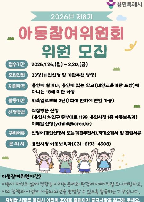 시 관계자는 “아동참여위원회는 지역의 아동 눈높이에 맞는 정책을 만들고 제안하는 중요한 역할을 담당하고 있다”며 “아동의 권리 증진과 보호에 관심 있는 아동들의 관심과 참여를 바란다”고 말했다.