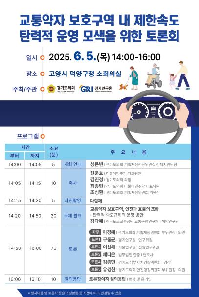 토론회는 경기연구원과 경기도의회가 공동 주최·주관하며 한준호 더불어민주당 최고위원, 김진경 경기도의회 의장, 최종현 경기도의회 더불어민주당 대표의원, 조성환 경기도의회 기획재정위원장 등의 축사로 문을 연다.