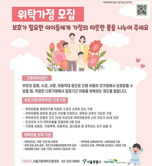 서울시가정위탁지원센터는 보호가 필요한 아동을 사랑으로 돌봐줄 ‘가정위탁부모’를 상시 모집한다.