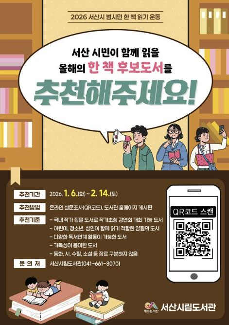 [세계로컬타임즈] 충남 서산시는 오는 1월 6일부터 2월 14일까지 2026년 범시민 한 책 읽기 운동의 후보 도서를 추천받는다고 밝혔다.