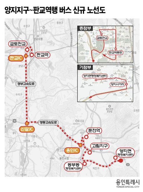 버스는 ▲양지면 행정복지센터 ▲양지사거리 ▲동부동 행정복지센터 ▲서울병원 ▲고림고‧유림2동 ▲유림동‧방축 ▲둔전역‧인정멜로디아파트 ▲금토천교 ▲판교역동편 등 정류소에 정차할 예정이다.