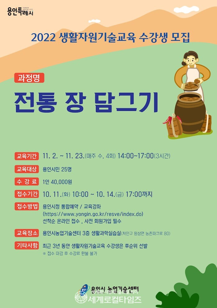 [세계로컬타임즈 이지안 기자] 용인시농업기술센터가 오는 11일 ‘전통 장 담그기’ 강좌에 참여할 수강생 25명을 선착순으로 모집한다고 4일 밝혔다.