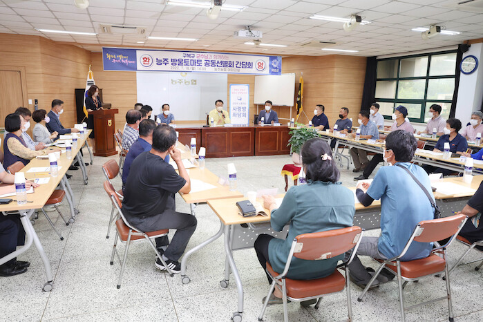 | ▲ 18일 능주농협에서 능주 방울토마토 공동선별회와 사랑방 좌담회를 하고 있는 구복규 화순군수.(사진=화순군) |