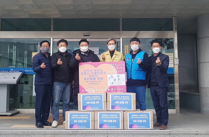 나주시 보건소는 최근 남평읍 자율방범대(대장 이정호)와 봉사단체인 우리동네히어로(단장 이수안)에서 선별진료소 의료진을 위한 방한의복 50벌(250만원 상당)을 후원했다고 29일 밝혔다.