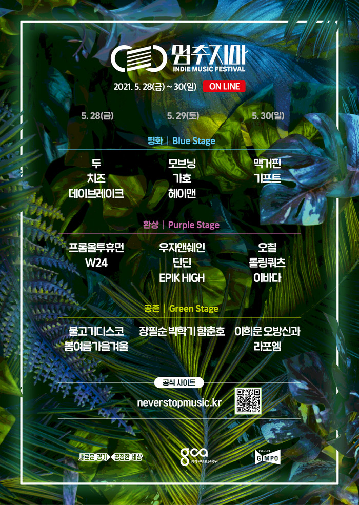 [세계로컬타임즈 이호 기자] 경기도와 경기콘텐츠진흥원이 개최하는 온라인 콘서트인 ‘멈추지마 인디뮤직페스티벌’의 라인업이 공개됐다.