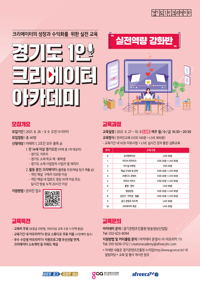 [세계로컬타임즈 이호 기자] 경기도와 경기콘텐츠진흥원이 9월 9일까지 ‘경기도 1인 크리에이터 아카데미’ 실전역량 강화반 교육생 40명을 모집한다.