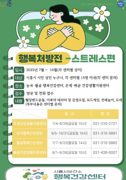 이형정 시흥시보건소장은 “스트레스는 누구나 겪을 수 있는 보편적인 문제인 만큼, 시민들이 가까운 곳에서 쉽게 정신건강 서비스를 접하고 회복할 수 있는 계기가 되길 바란다”라고 밝혔다.