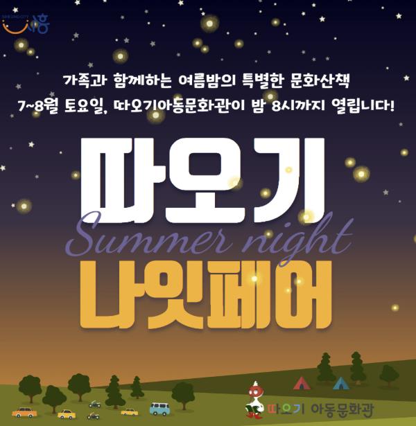‘따오기 나잇페어’는 7월과 8월 매주 토요일, 운영 시간을 기존보다 2시간 연장해 오후 8시까지 문화관을 개방하는 야간 문화행사로, 무더운 여름 저녁 시간, 가족 단위 방문객들이 더욱 여유롭게 문화를 즐길 수 있도록 마련됐다.