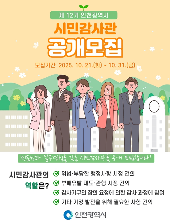 [세계로컬타임즈] 인천광역시는 제12기 시민감사관을 10월 21일부터 10월 31일까지 공개모집한다고 밝혔다.