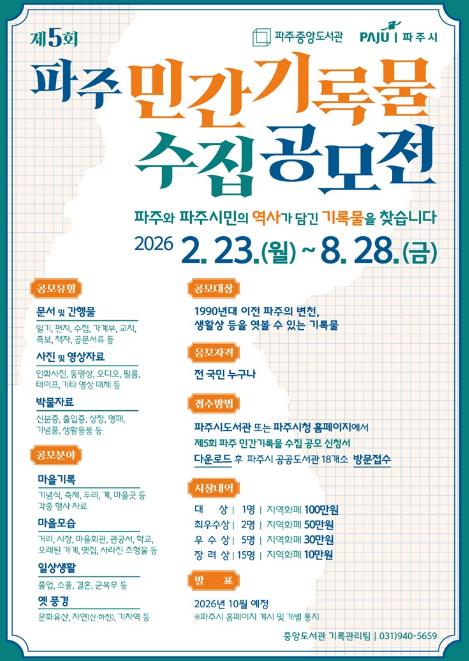 올해로 5회째를 맞는 이번 공모전은 개인의 일상과 마을의 변화, 시대의 흔적이 담긴 자료들을 발굴해 파주의 역사를 보다 입체적으로 조명하고, 지역 공동체의 기억을 다음 세대에 전승하는 데 목적이 있다.