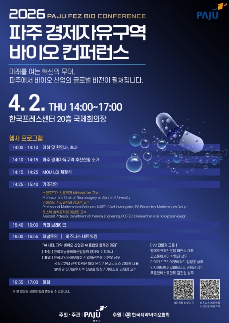 파주시 관계자는 “이번 행사는 국제 바이오산업의 최신 흐름을 공유하고 기업과 연구기관 간 협력 기반을 확대하는 의미 있는 자리가 될 것”이라며 “앞으로도 바이오산업 생태계 조성과 투자유치를 통해 파주 경제자유구역이 첨단 산업의 새로운 성장 거점으로 자리매김할 수 있도록 노력하겠다”라고 말했다.