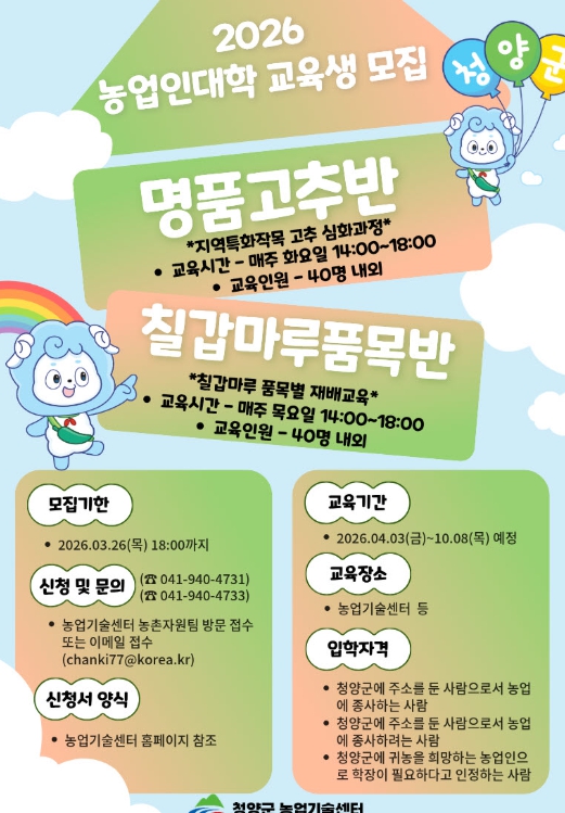 올해 농업인대학은 청양군의 전략 특화 품목에 대한 전문성을 극대화하기 위해 ▲명품고추과정 ▲칠갑마루품목과정 등 2개 과정을 개설했다. 교육은 오는 4월 3일부터 10월 8일까지 약 7개월간 진행되며, 농번기 일정과 현장 상황을 고려해 탄력적으로 운영될 예정이다.