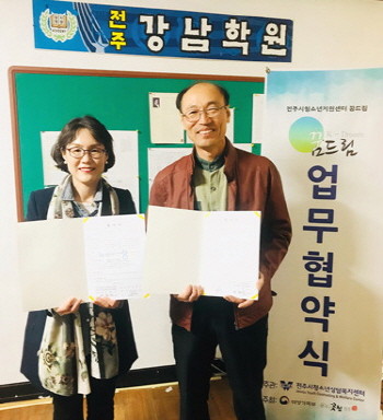 | ▲ 전주시학교밖청소년지원센터가 학교밖 청소년의 수능 대비를 위한 업무협약을 전주강남학원과 체결하고 있다.(사진=전주시 제공) |