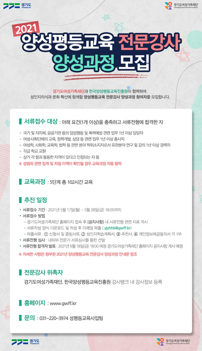 17일부터 28일까지 경기도여성가족재단 홈페이지에서 서류작성 양식(신청서 및 증빙서류·성인지 학습계획서·추천서·개인정보 제공동의서)을 이메일로 제출하면 된다.