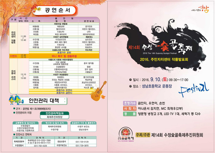 성남시립국악단의 타악기 퍼포먼스, 수정구여성합창단 공연, 수정구상인연합회 제로 댄스팀의 공연 등을 함께 할 수 있다.