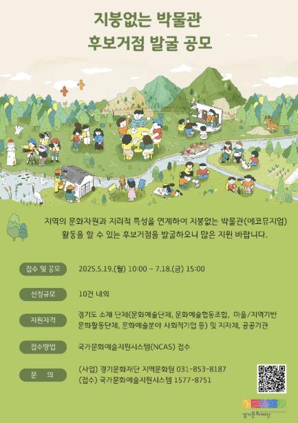 경기문화재단은 ‘지붕없는 박물관(경기에코뮤지엄)’ 사업을 통해 지역의 문화자원, 자연환경, 역사적 장소 등을 발굴하고 이를 문화적으로 재해석하여 지역 정체성과 공동체 회복을 도모해 왔다. 그 간의 성과를 바탕으로 지속 가능한 지역 거버넌스 체계 구축과 자생력 있는 운영 주체 육성을 위해 지역의 문화자원과 지리적 특성을 연계한 지붕없는 박물관 활동 및 공간 운영을 할 수 있는 대상지 후보거점의 본격적인 발굴에 나선다.