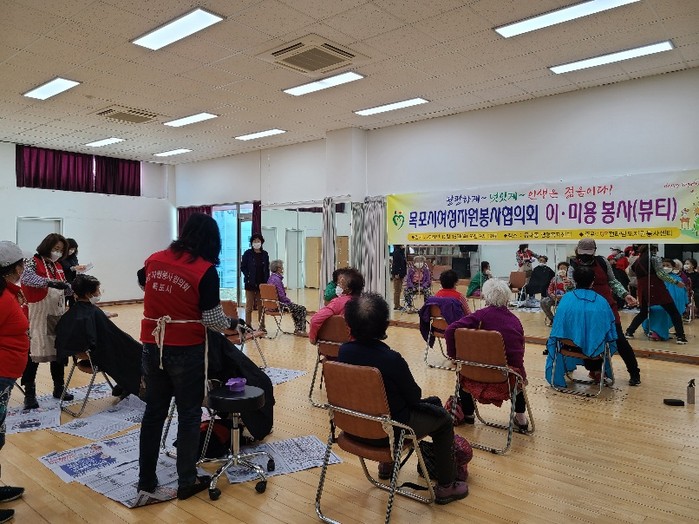 | ▲ 목포여성자원봉사협의회 회원들이 이미용봉사를 실시하고 있다.(사진=목포시) |
