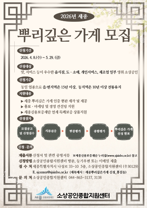 뿌리 깊은 가게로 선정된 업체에는 ▲인증 현판 제공 ▲홍보 지원▲맞춤형 경영 컨설팅 ▲세종신용보증재단의 소상공인 특별자금 심사 우대 등 행·재정적 지원을 받을 수 있다.