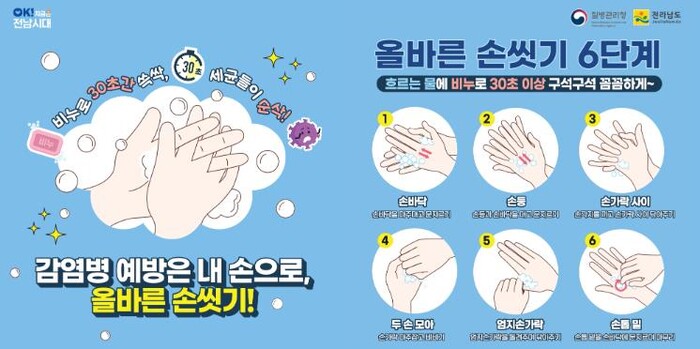 정광선 전남도 보건복지국장은 “손 씻기는 가장 간단하지만 가장 효과적인 감염병 예방법”이라며 “도민 한 사람 한 사람의 작은 실천이 지역사회 전체의 건강을 지키는 힘이 되는 만큼, 생활 속 개인위생 실천에 적극 동참하길 바란다”고 말했다.